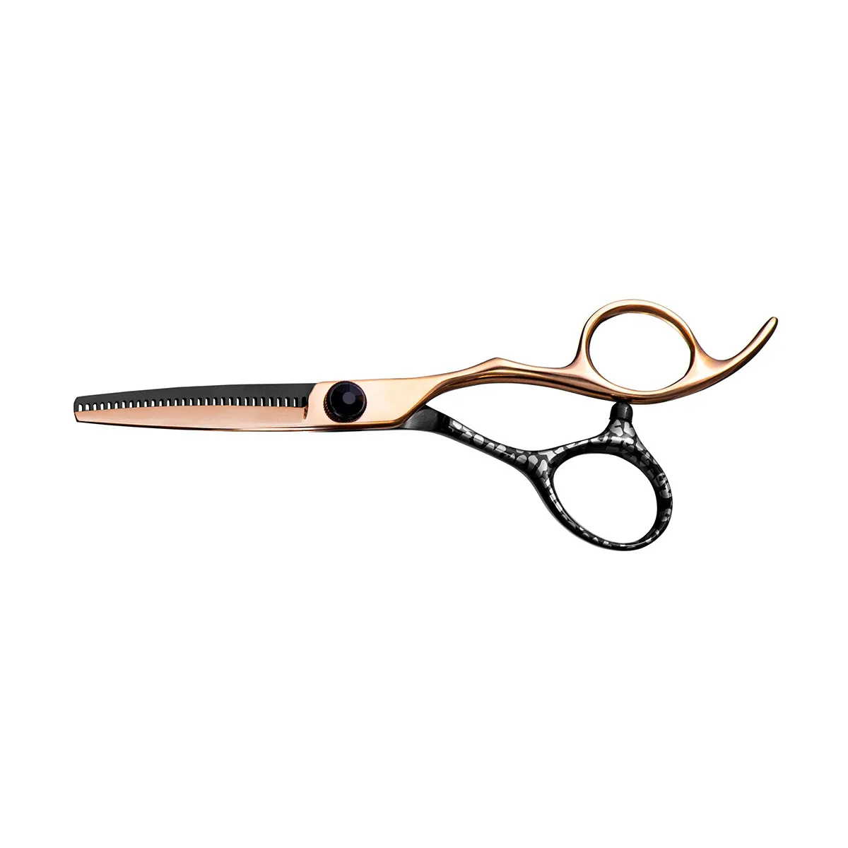 Fabricada con acero inoxidable de alta calidad, esta tijera cuenta con una empuñadura offset que proporciona comodidad durante largas sesiones de trabajo. Sus 28 dientes distribuyen el cabello de manera uniforme, logrando una reducción precisa del volumen sin tirones ni marcas visibles.
