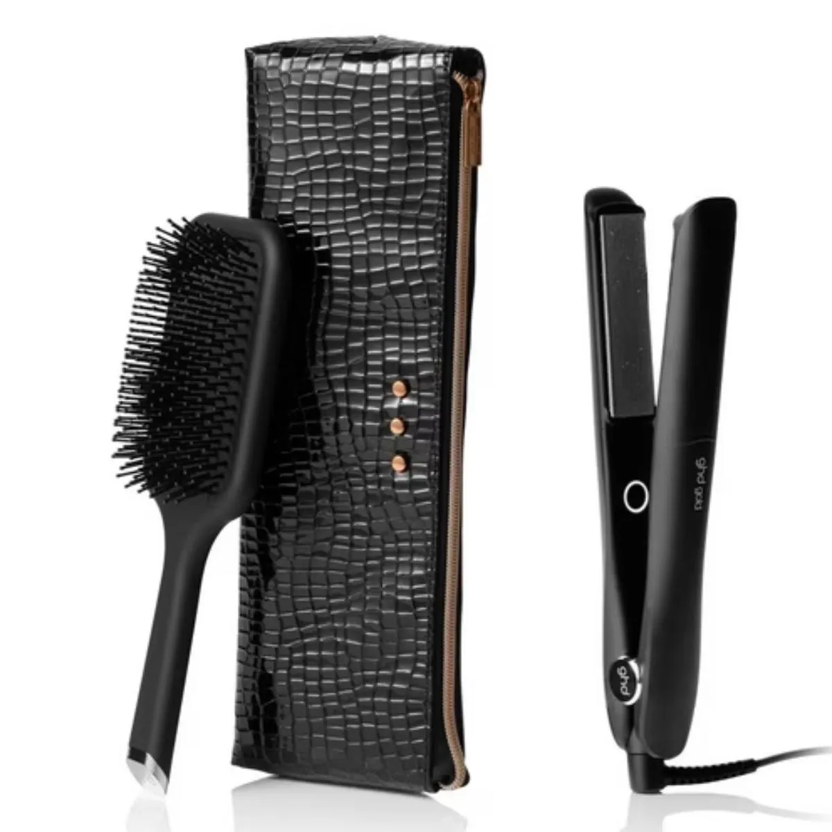 El pack completo integra tres elementos seleccionados cuidadosamente: plancha profesional ghd Gold® con su tecnología Dual-zone característica, cepillo ghd paddle imprescindible para desenredar, suavizar y pre-secar amplias secciones capilares simultáneamente gracias a su base plana extendida, y neceser termo-resistente coordinado que facilita almacenamiento seguro y sofisticado. Conjunto diseñado para crear peinados pulidos rápida y cómodamente sin complicaciones.