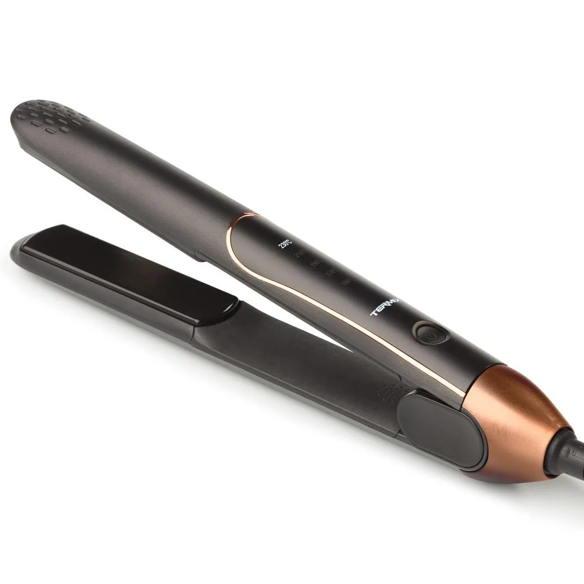 - Regulador de temperatura en cinco niveles (150 °C a 230 °C) que se adapta con precisión a cada tipo de cabello.