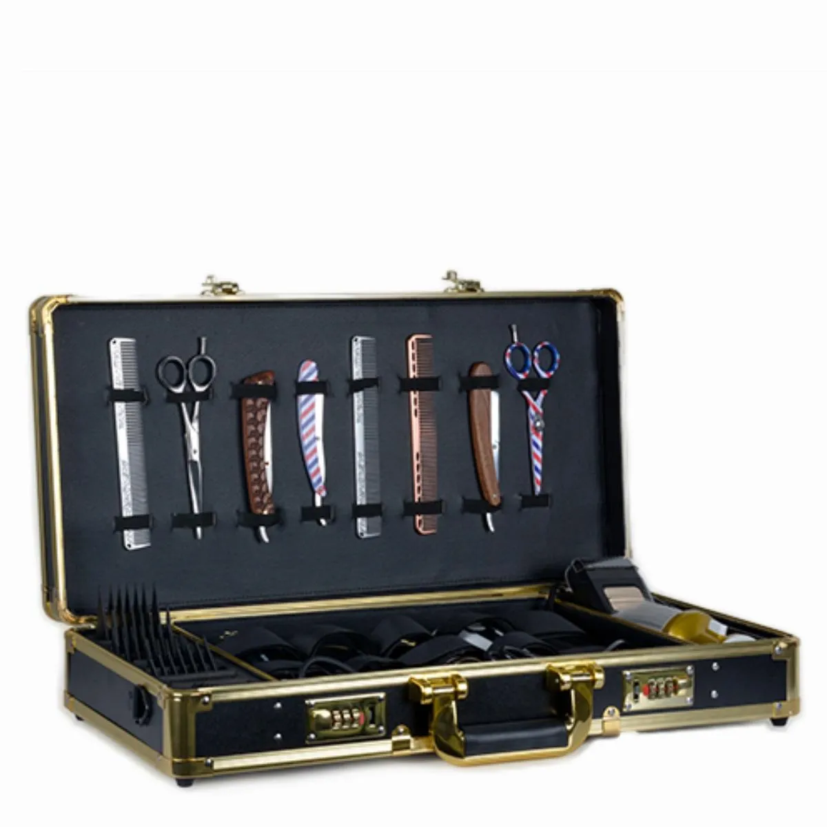 - Espacio interior amplio para máquinas, tijeras, navajas y accesorios.